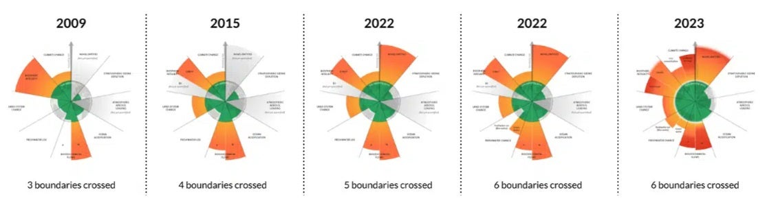 環境破壊の度合いを9つの指数として定点観測し、人間が地球上で安全に生活できる限界値をプラネタリーバウンダリーと呼びます。2023年9月に発表された結果では、9つのうちすでに6つが限界値を超えており、地球が不可逆的な傷を負ってしまう可能性が非常に高いことが示唆されました。